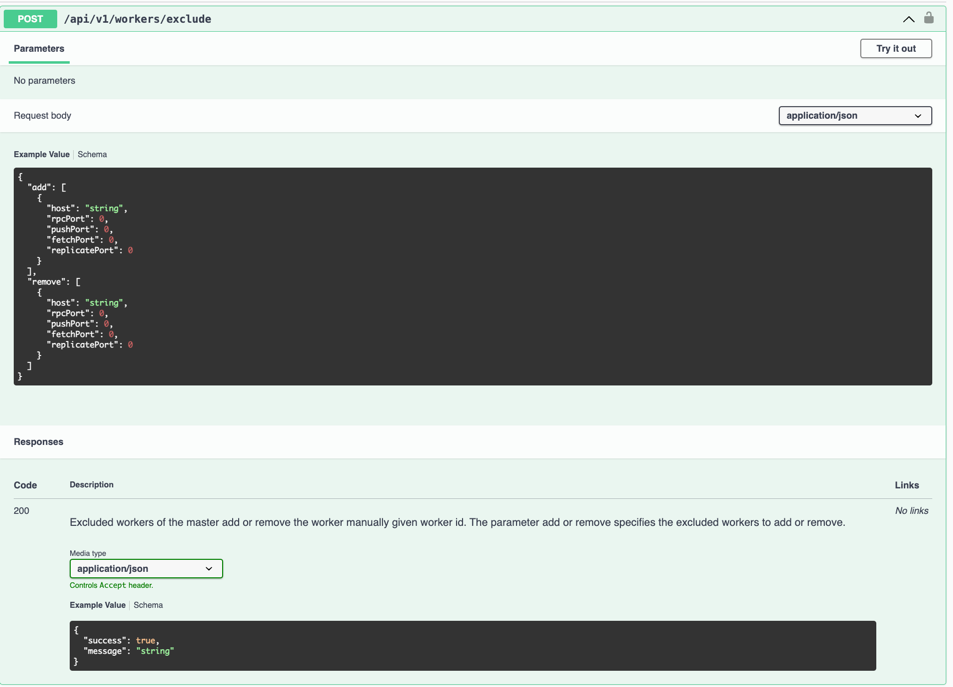 To re-add a Worker to the cluster, simply call the Master’s POST /api/v1/workers/exclude and put the Worker information in the remove field to remove the Worker from the manualExcludedWorkers list, allowing it to assign slots again.