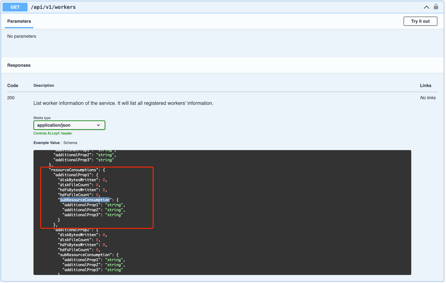 resourceConsumptions is a map where the key is userIdentifier and the value is the user’s resource usage, including diskBytesWritten, diskFileCount, hdfsBytesWritten, hdfsFileCount, and subResourceConsumptions.