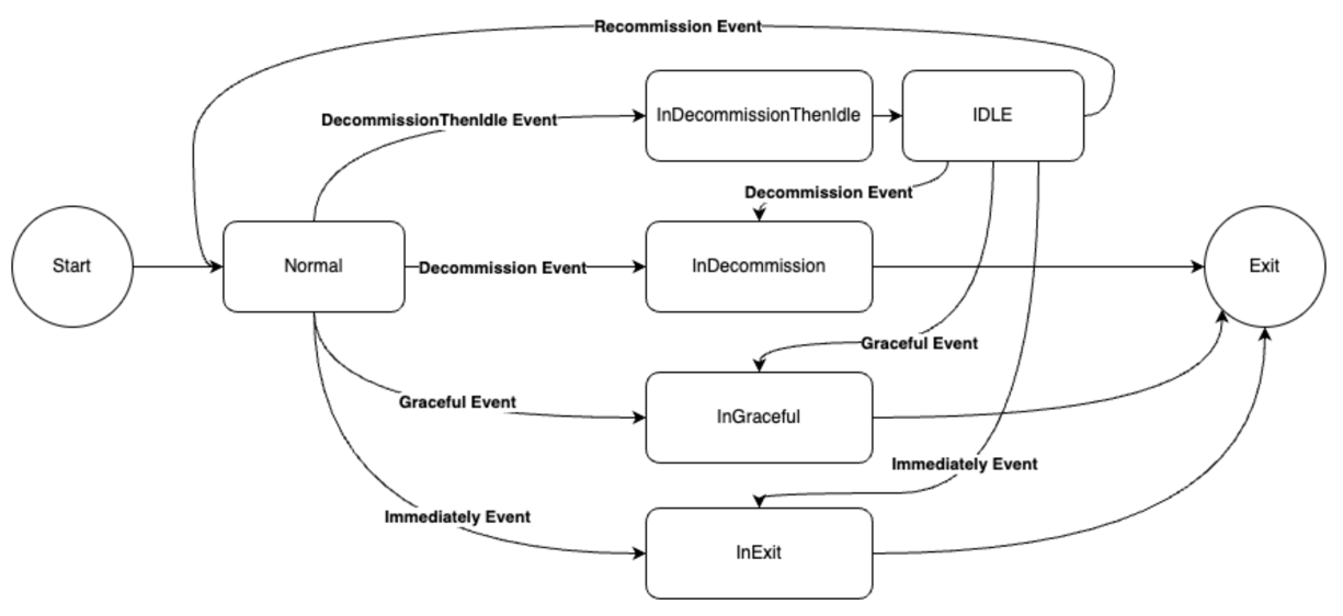 Since the Worker process will be automatically restarted by systemctl after exiting, we choose to use the DecommissionThenIdle event for decommissioning to better control the Worker’s state.