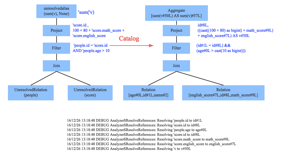 - 使用 analyzer 结合数据数据字典 (catalog) 进行绑定, 生成 resolved LogicalPlan;