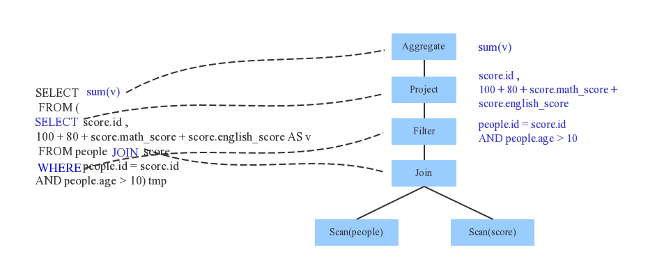 val teenagersDF = spark.sql("SELECT SUM(v) FROM (SELECT score.id, 100+80+ score.math_score +score.english_score AS v FROM people JOIN score WHERE people.id=score.id AND people.age >100) tmp")