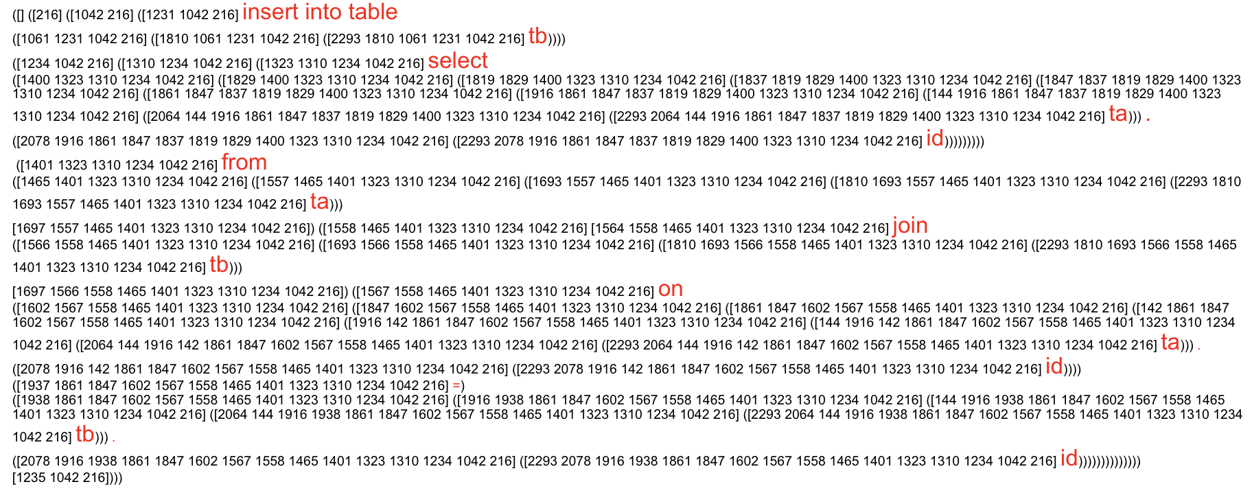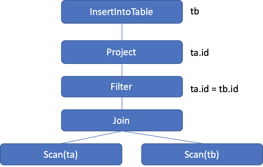 如下图所以,一条SQL语句INSERT INTO TRABLE tb SELECT ta.id FROM ta JOIN tb on ta.id=tb.id会被大概转化为下面一个AST.